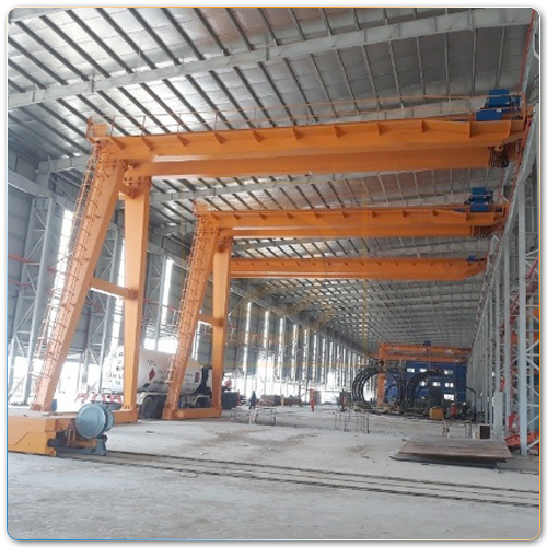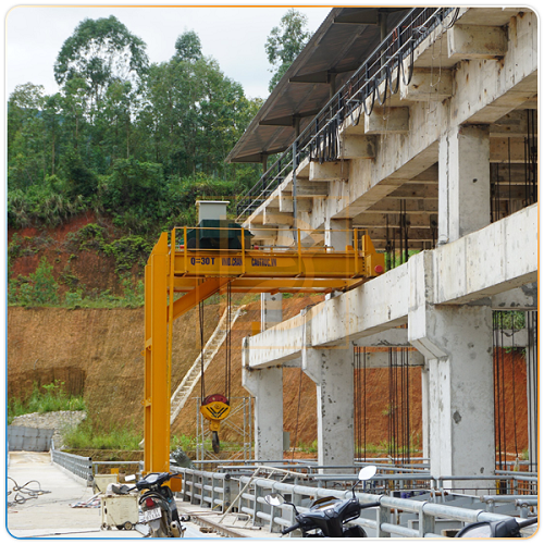 - Được thiết kế cải tiến với một bên chân cổng trục gối lên dầm đỡ ray liên kết với tường nhà xưởng nhằm khắc phục hạn chế về mặt không gian di chuyển của cổng trục dầm đôi