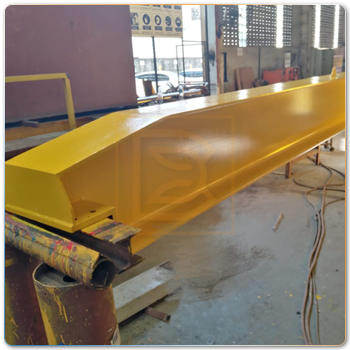 - Tổ hợp dầm biên cầu trục cũng bao gồm các bước giống như tổ hợp dầm chính. Thêm vào đó là khâu khoét lỗ để lắp hai cụm bánh xe di chuyển & động cơ dầm biên. Hai đầu dầm được gắn cao su giảm chấn.