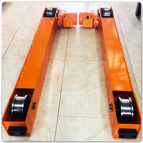 - Dầm biên: được thiết kế theo kiểu đặc biệt với 2 cụm bánh xe hai bên & di chuyển bên dưới bản cánh dầm đỡ thay vì di chuyển trên ray(P) như cầu trục dầm đơn. Cấu tạo dầm biên bao gồm kết cấu khung dầm biên, động cơ giảm tốc, bánh răng truyền động & bánh xe(chủ động & bị động). Đây là cơ cấu di chuyển cả hệ cầu trục dọc theo chiều dài nhà xưởng.