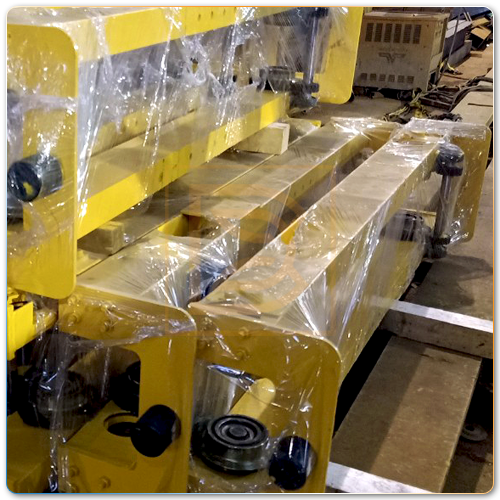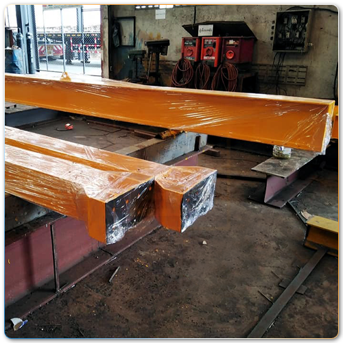 - Tổ hợp dầm biên cầu trục cũng bao gồm các bước giống như tổ hợp dầm chính. Thêm vào đó là khâu khoét lỗ để lắp hai cụm bánh xe di chuyển & động cơ dầm biên. Hai đầu dầm được gắn cao su giảm chấn.