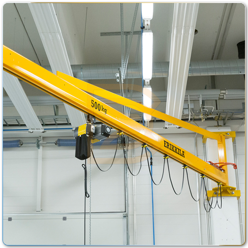 - Nó có cấu tạo là một hệ dầm đỡ tời hoặc palang chạy điện hoặc palang kéo tay được lắp trên trục xoay được lắp cố định vào cột của nhà xưởng.